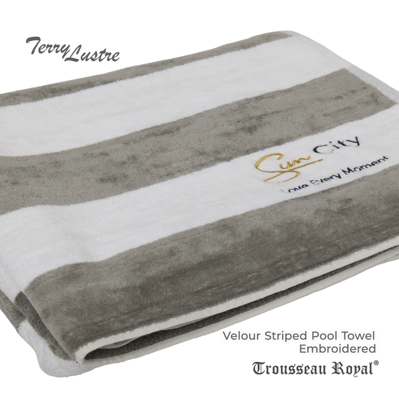 Trousseau Royal Velour Striped Pool Towels by Terry Lustre offers rich texture and superior absorbency, perfect for lounging. Terry Pool Towels (450gsm), provide a high – textured, looped weave, absorbent feel – ideal for drying. Perfect for homes, guesthouses, hotels and luxury pool or beach settings.